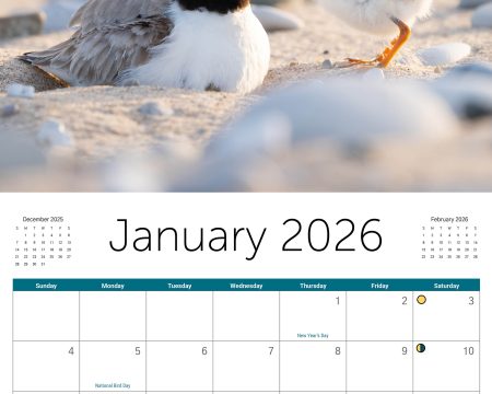 Calendars are saddle stitched with a pre-drilled hole for hanging. Many holidays and moon phases are noted.